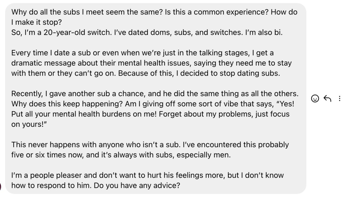 "Why does every sub I meet seem to rely so heavily on me, especially with their mental health issues? Is it something I’m doing, and how can I make it stop?"